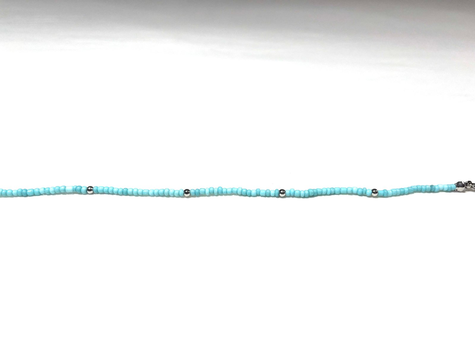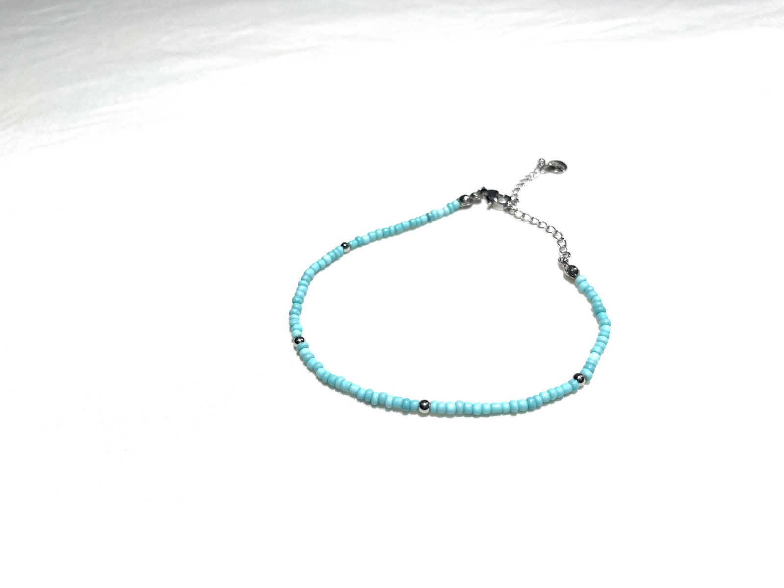 Ce bracelet de cheville est composé de petites perles argentées et bleu ciel.