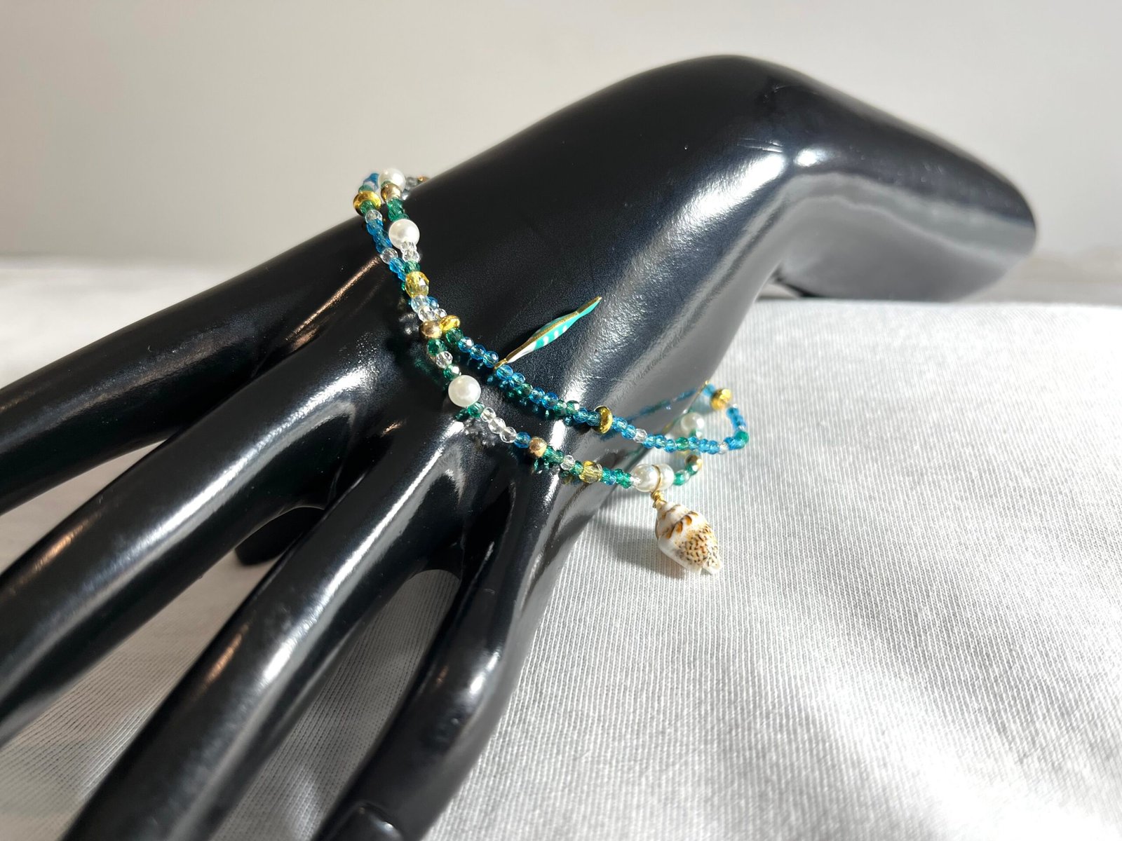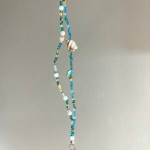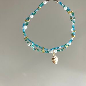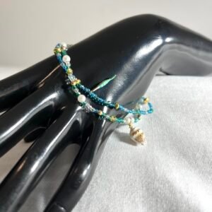 Ce bijou est un ensemble de perles en verre bleu ciel, vert clair, blanches transparentes, de fines perles de nacre de culture blanches ainsi que de nombreux espaceurs dorés.