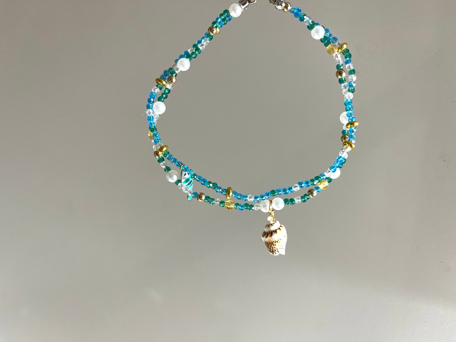 Ce bracelet est composé de deux brins rigides sur lesquels pendent un joli poisson vert clair et un coquillage escargot naturel.