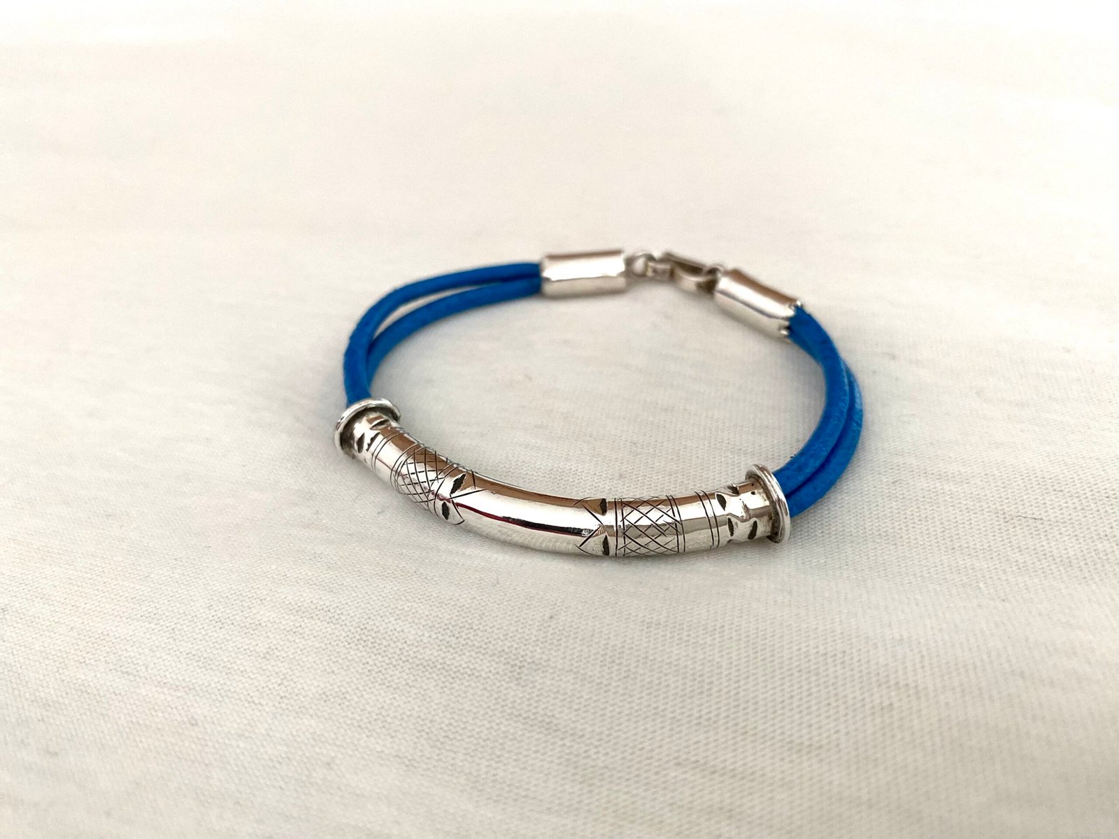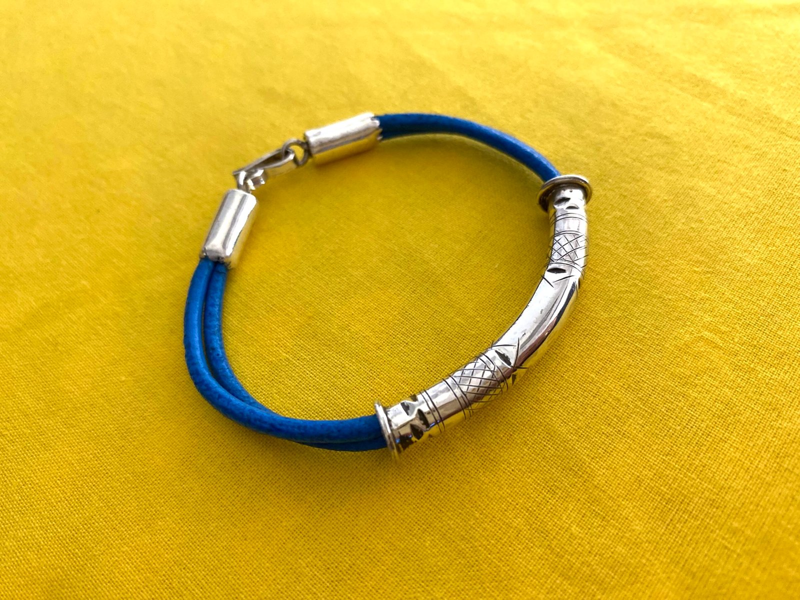 L’originalité de ce bijou vient de la couleur bleue des lanières de cuir. Le médaillon est également unique car tatoué par la main de nos artisans.