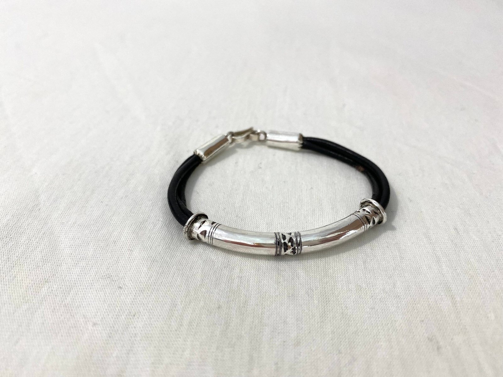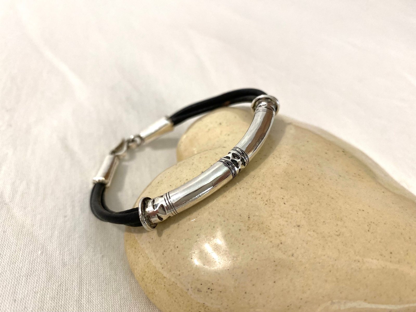 Bracelet I Hinza en argent gravé et cuir noir