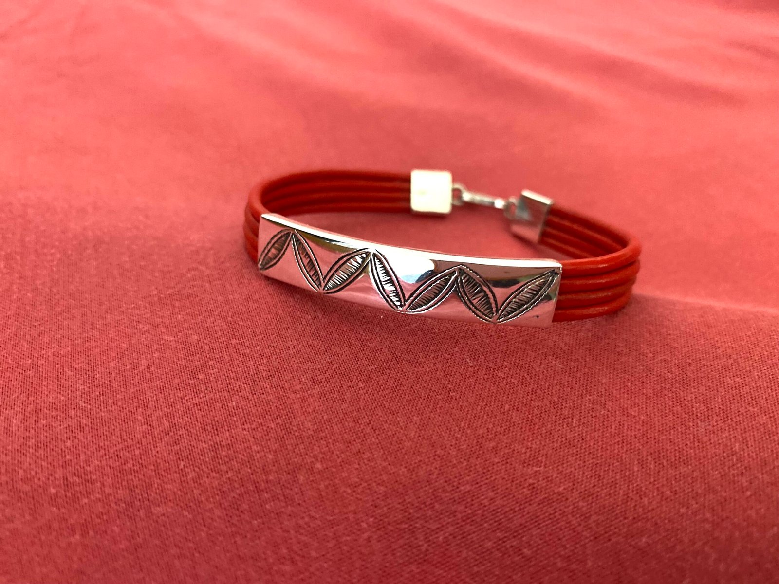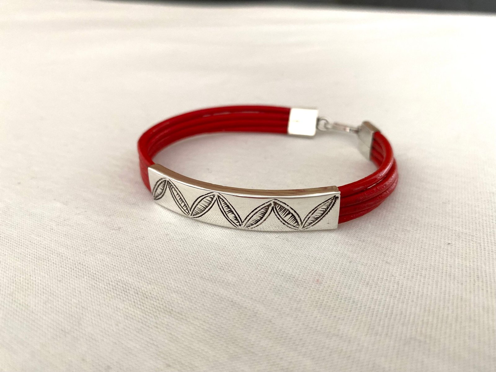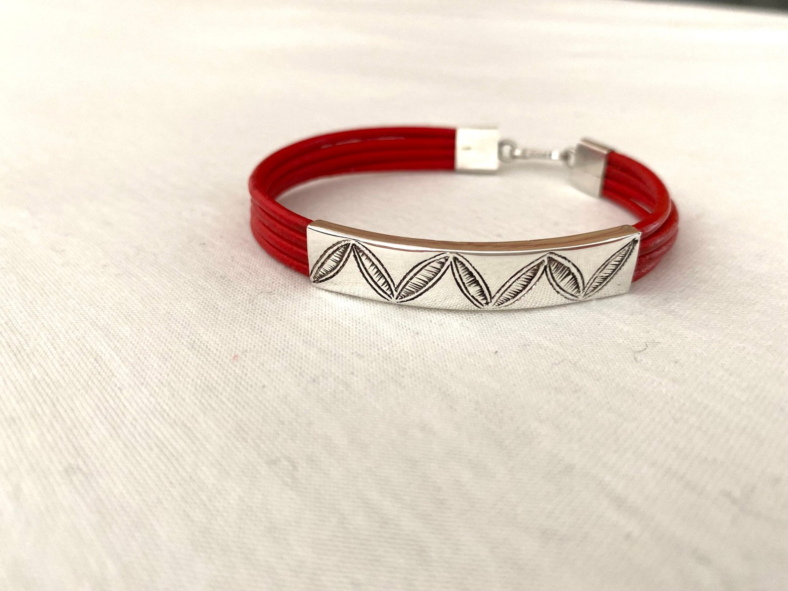 Les gravures en forme de grains de café sont de toute beauté ! L’association du rouge des lanières avec le gris brillant de l’argent est parfait.