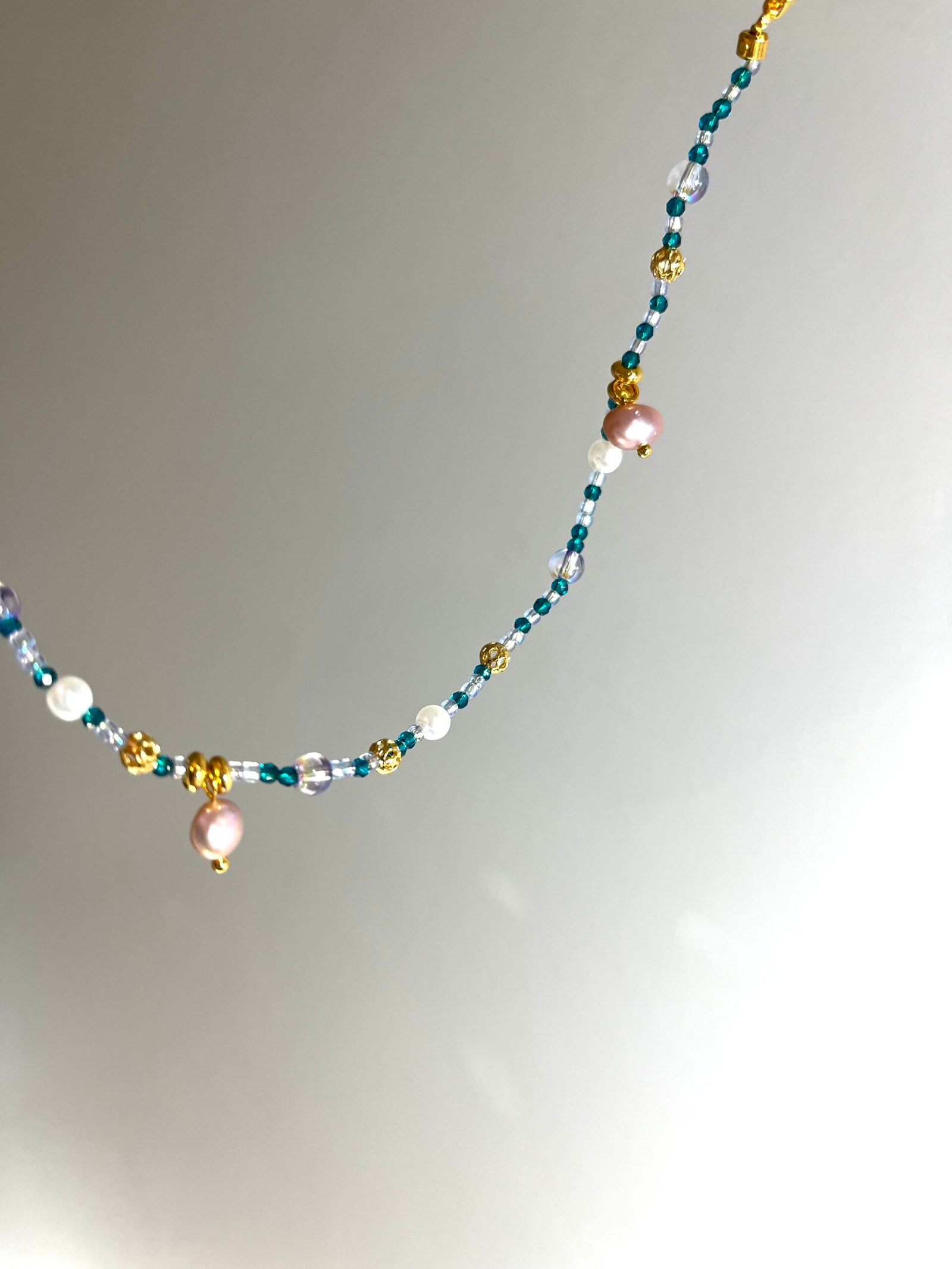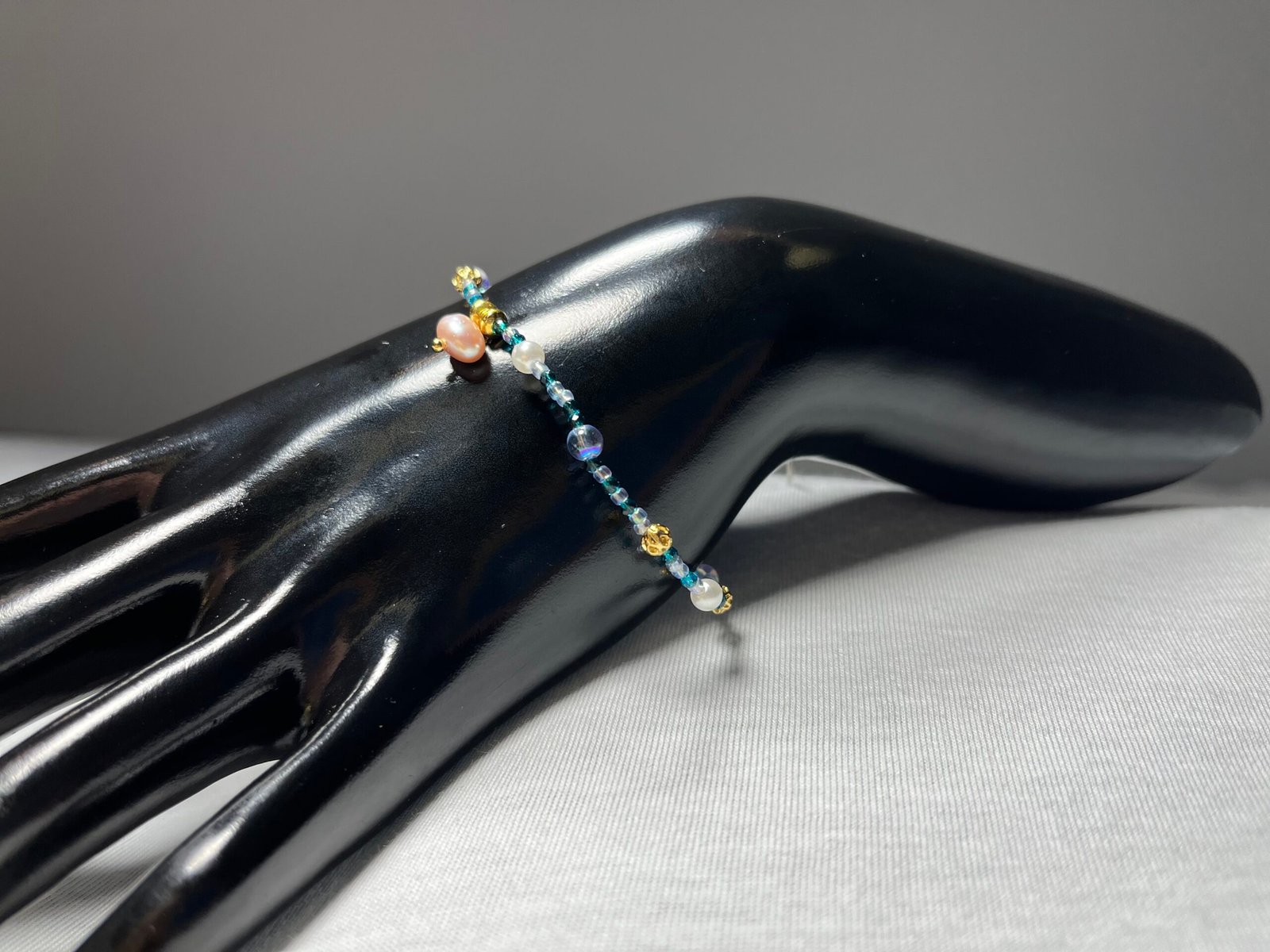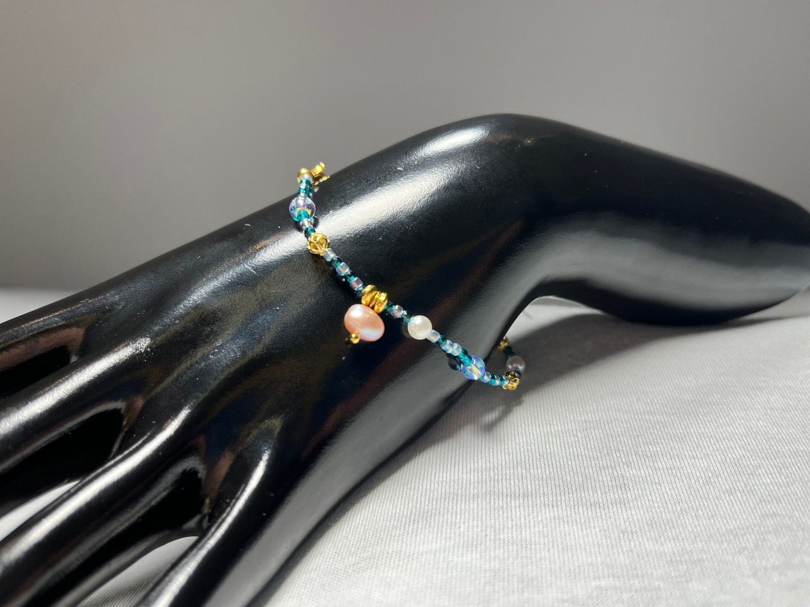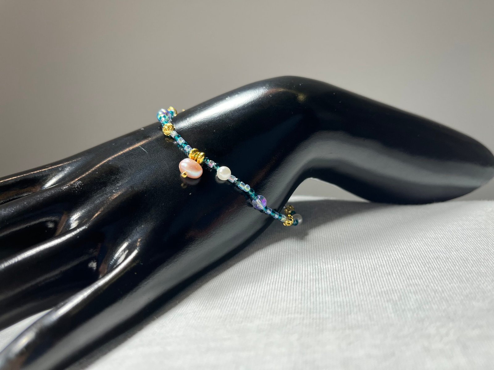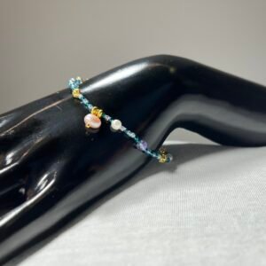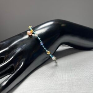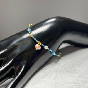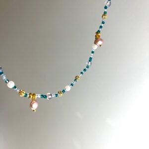 Ce bijou est magnifiquement monté avec des perles en verre bleues, blanches transparentes ainsi que des perles avec de jolis reflets violets. De petites sphères dorées amènent de la vivacité à ce bijou d’exception !