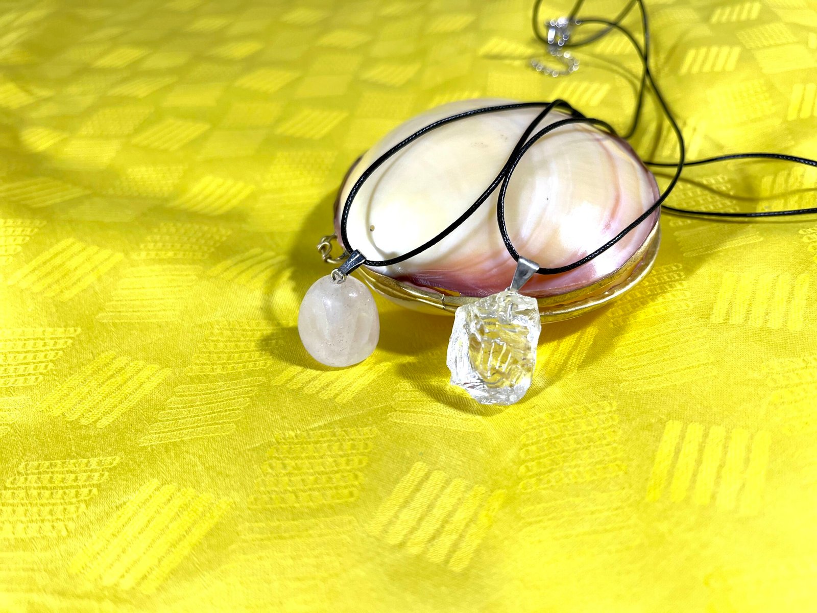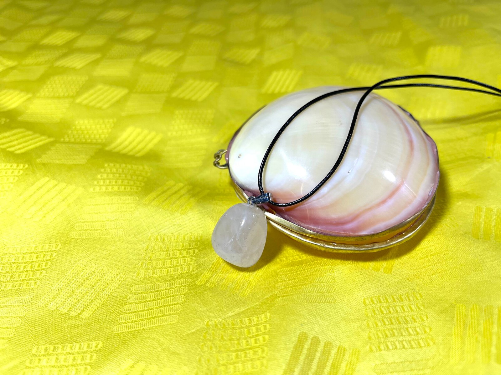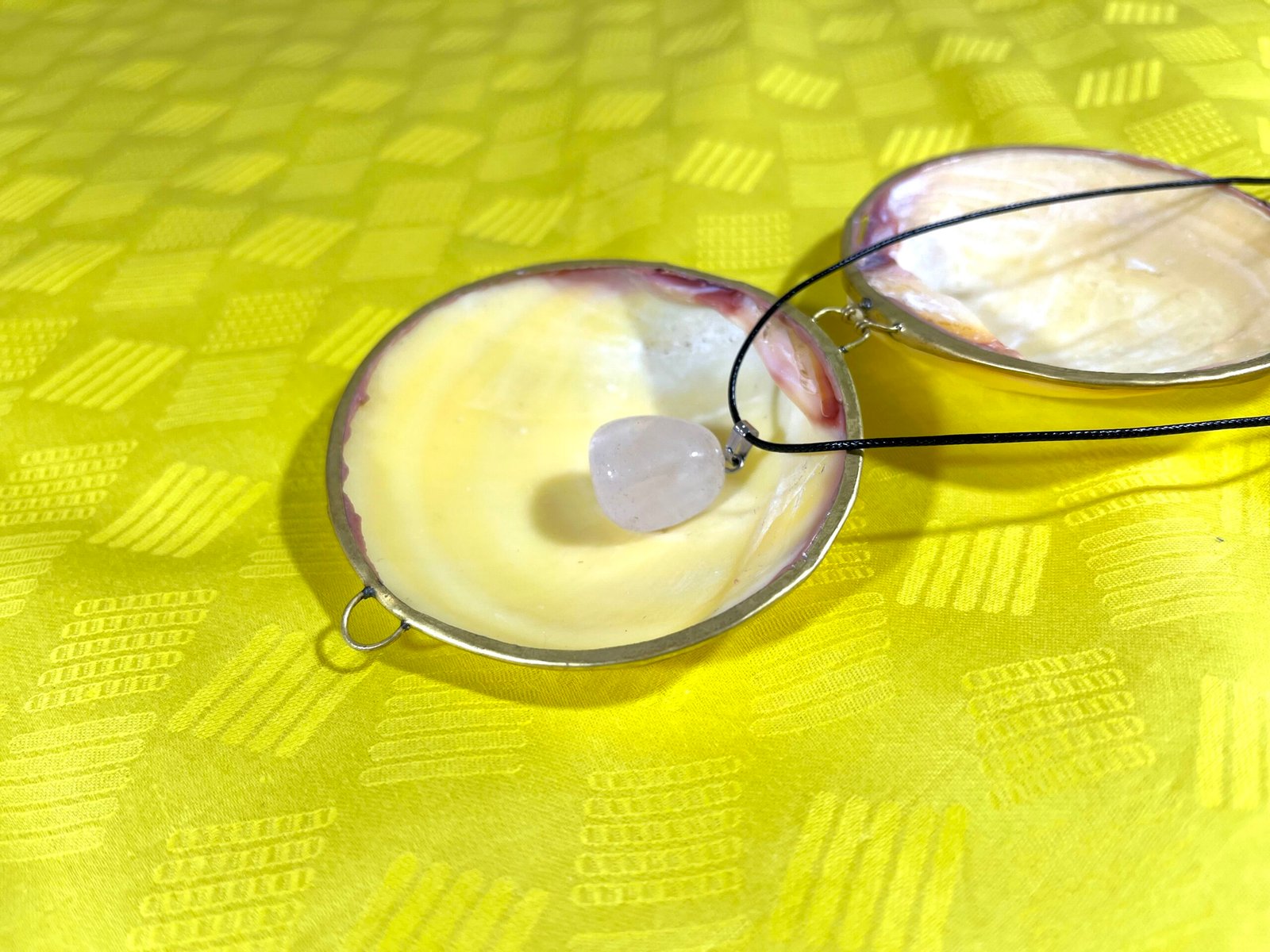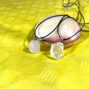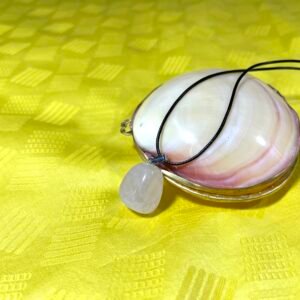 Ce collier se compose d’une belle pierre transparente rose de quartz poli et d’une lanière noire.